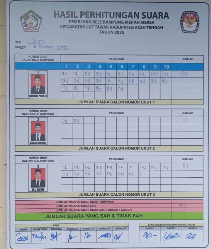SuaraParlemen.co, Takengon – Pemilihan Reje (Kepala Desa) Merah Mersah di Kecamatan Lut Tawar, Kabupaten Aceh Tengah, yang berlangsung pada Sabtu, 18 Oktober 2025, telah resmi ditutup dengan penentuan pemenang. Proses demokrasi di tingkat akar rumput ini berlangsung sengit dan dinanti oleh seluruh warga.